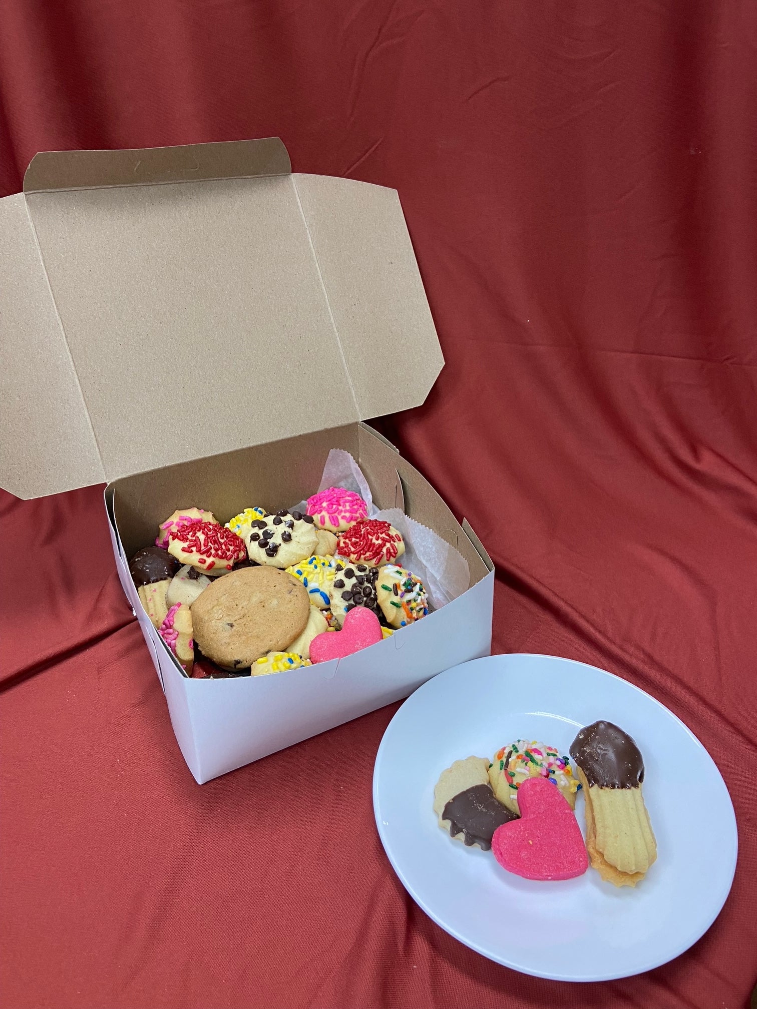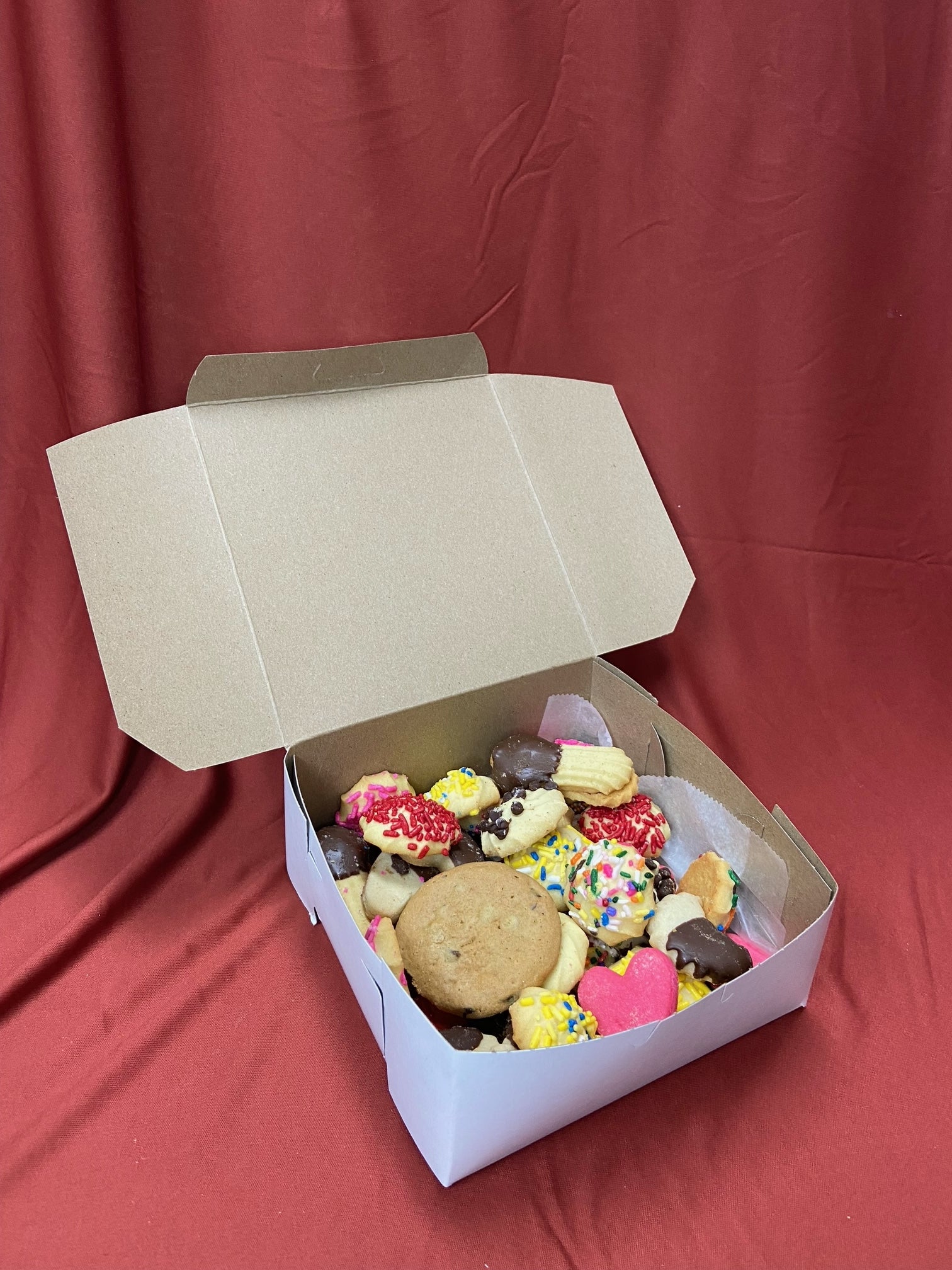 Enjoy our homemade butter cookies no matter where you live! Our 1lb box comes mixed with Leaf Cookies, Florentine Lace, Pink Hearts, Jelly Fingers, Sprinkle Cookies, Chocolate dipped, plus more! **We are not an allergy free location, please be mindful when ordering that items may contain common allergens.**