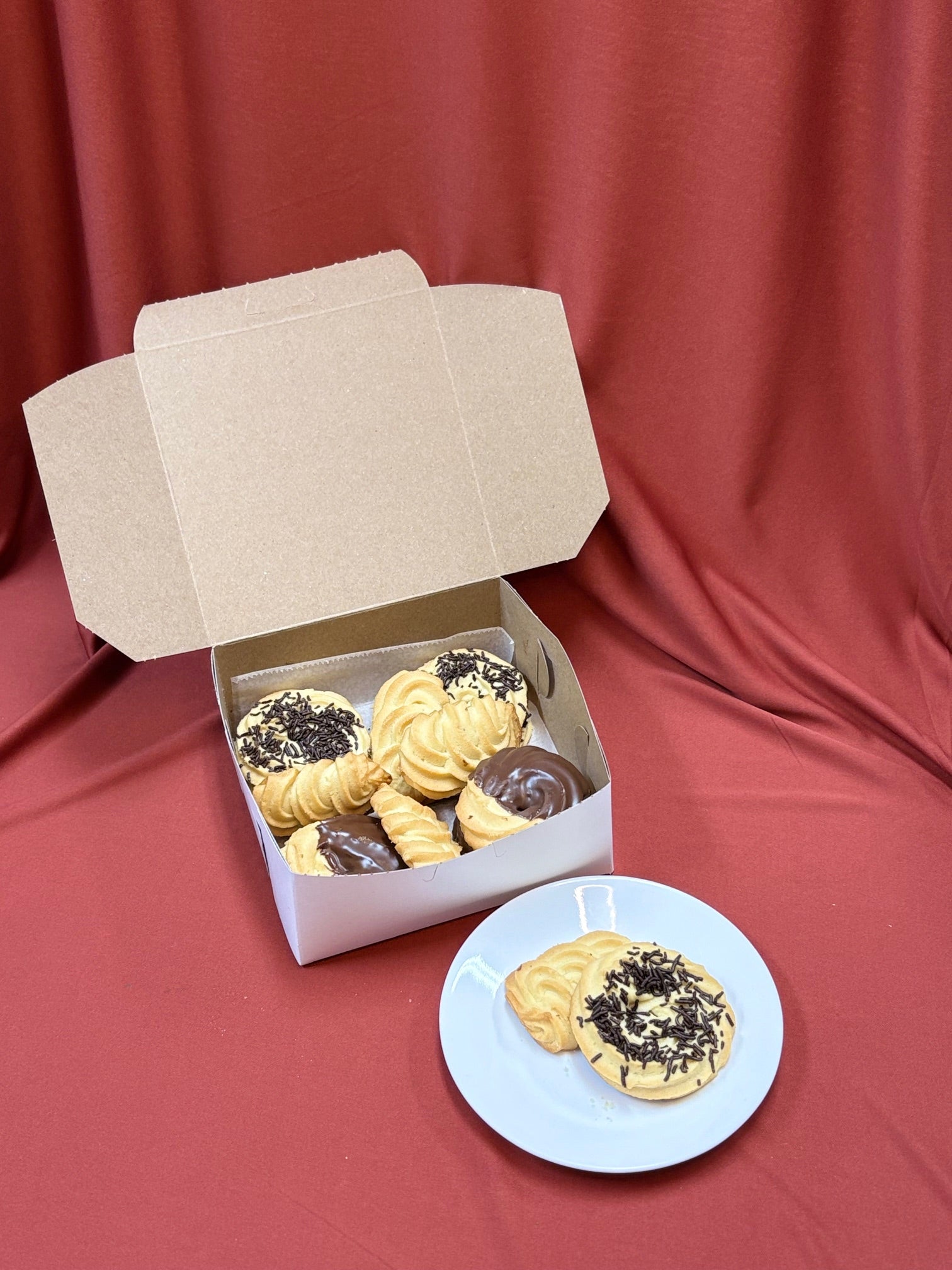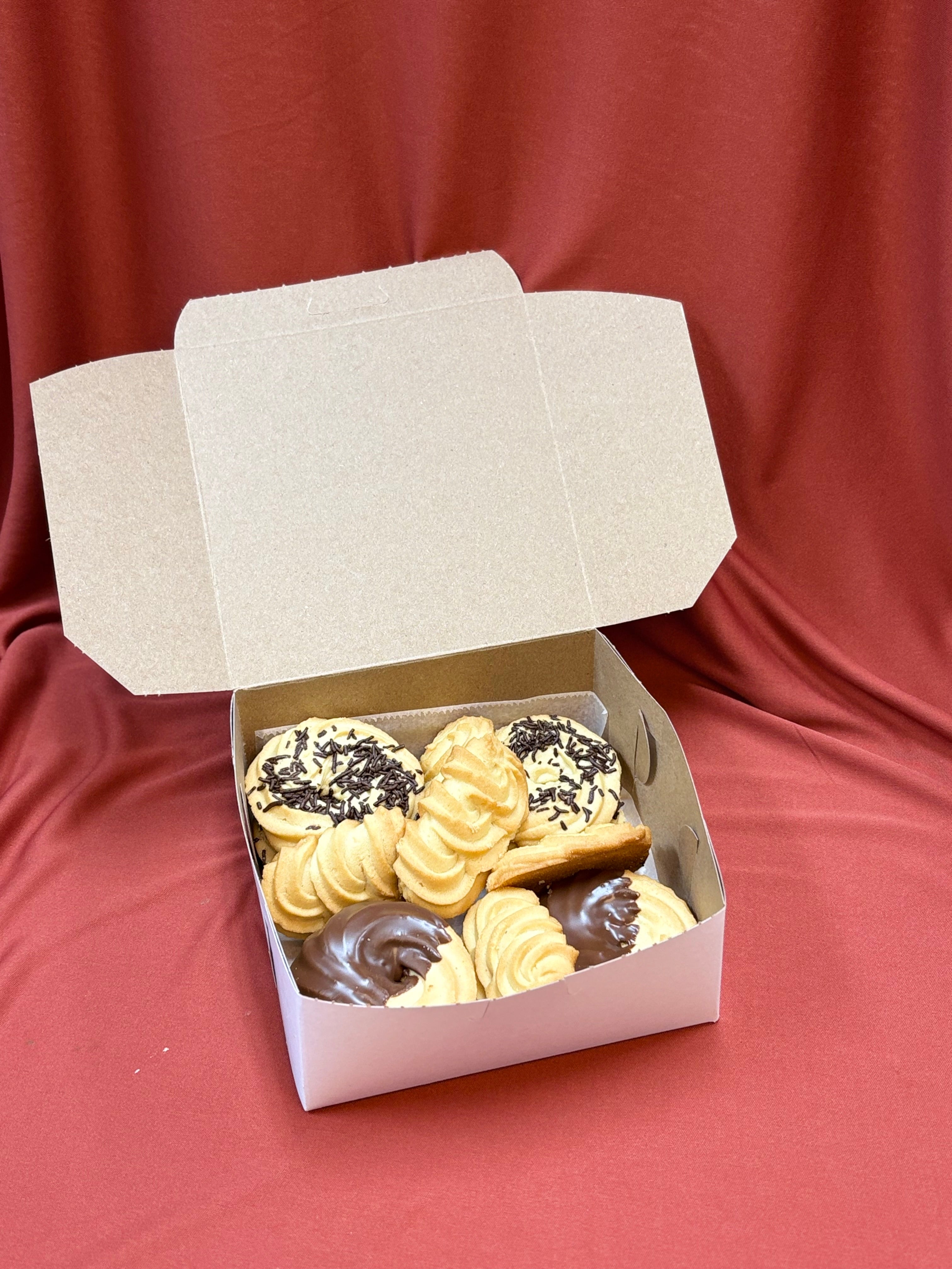 Enjoy our homemade big butter cookies no matter where you live! Our 1lb box comes mixed with Big Sprinkle Cookies, Big Chocolate Dipped Cookies, & Big Plain Butter Cookies **We are not an allergy free location, please be mindful when ordering that items may contain common allergens.**
